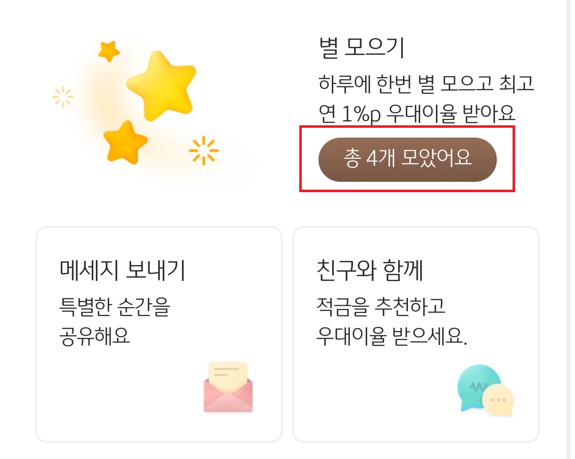 특별한 적금은 목표금액이 50만 원 이하이면 0.5%이고, 목표금액이 50% 초과이면 연 1.0%의 우대금리를 받습니다. 목표금액은 최소 1천 원 이상에서 최대 210만 원 이내로 설정할 수 있다. 계속해서 다음을 눌러 가입절차를 진행한다. 기본 정보 입력을 마치면 부가정보 입력란이 나온다. 이때 친구추천 인증번호를 입력하는 항복이 있습니다. 여기에 추천인과 피 추천인 모두 0.5%의 우대이율을 받습니다. 우대이율 목표금액 달성 목표금액을 만기일 전까지 달성하면 우대이율을 받을 수 있으며, 50만 원 이하이면 0.5%의 우대이율, 50만 원 초과 1% 별 모으기 일종의 출석체크 개념으로, 별 20개를 모으면 1% 를 받을 수 있습니다.