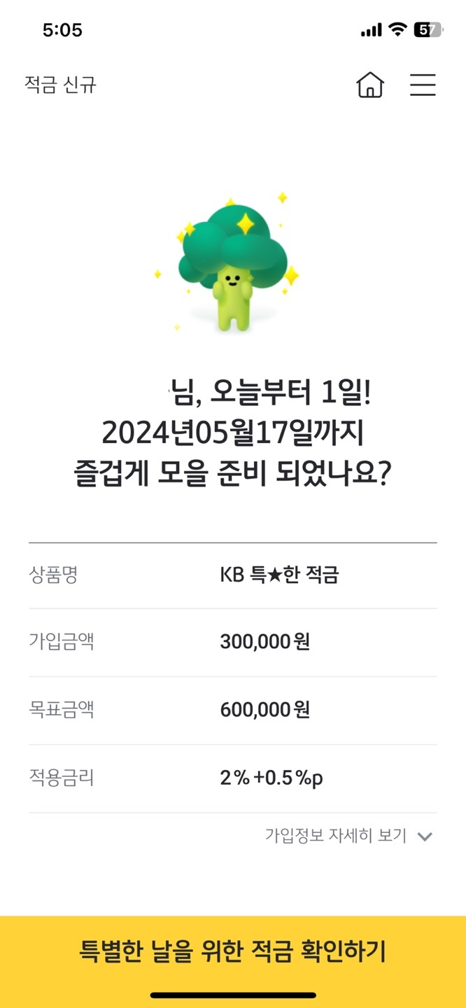 가입기간은 일단위, 월단위로 설정할 수 있고, 월단위로 1개월 이상에서 6개월 이하까지로 설정할 수 있습니다. 하지만 일 단위로 설정하게 되면 한 달 미만으로는 가입이 불가하며, 또한 저축금액은 월 1천 원부터 30만 원까지 가능합니다. 앱 하단의 가입이라고 쓰인 노란 버튼을 누르면 특별한 적금의 가입절차가 시작됩니다.