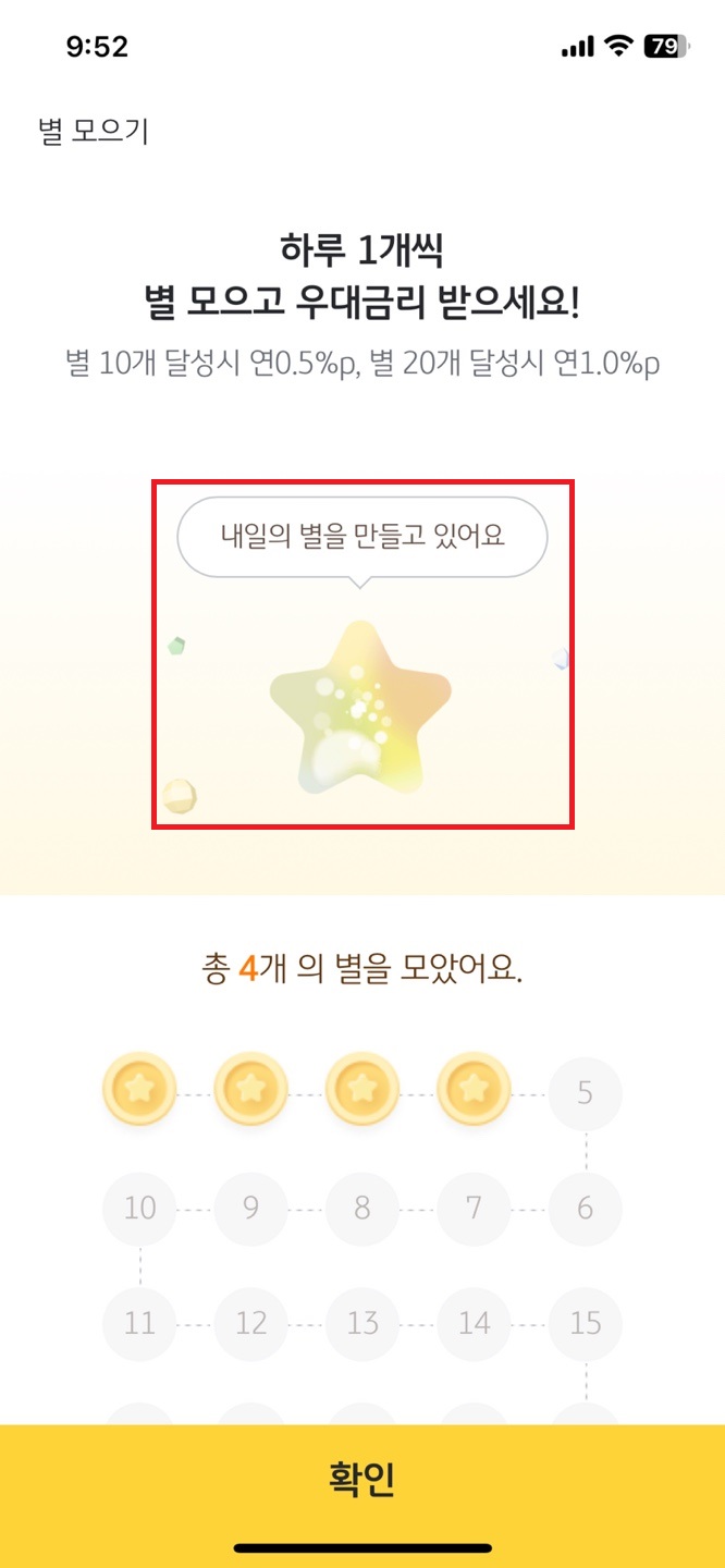 해당 계좌 오른쪽 하단 밑을 보면 전용화면이 있습니다. 전용화면에 들어가 별 모으기를 클릭하면 별이 생성된 것을 보실 수 있습니다. 현재 저는 별을 받았기 때문에 노란색 별이 보이진 않지만 하루에 한 번씩 방문하시어 보시게 될 별 색깔은 노란색입니다. 출석체크 개념식으로 클릭해 주시면 별이 모아지며 20개를 모으면 1%를 받을 수 있다는 것을 잊지 마세요.